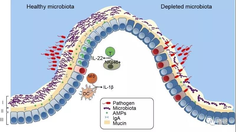 從下圖可以看出,左側(cè)的腸黏膜特點(diǎn)為存在致病微生物(Pathogen,紅色小蝌蚪狀),還存在豐富的益生菌(Microbiota,小螞蟻狀),只有很少的致病微生物進(jìn)入粘蛋白層(Mucin,黃色部分),而且在粘蛋白層內(nèi)存在豐富的抗菌肽(AMPS,紅色小圓點(diǎn))和免疫球蛋白A(IgA),此外免疫細(xì)胞T細(xì)胞也已被激活。而右側(cè),益生菌很少,這樣就無(wú)法誘導(dǎo)腸黏膜上皮細(xì)胞產(chǎn)生足夠的粘蛋白,薄的粘蛋白層起到的物理屏障就弱。