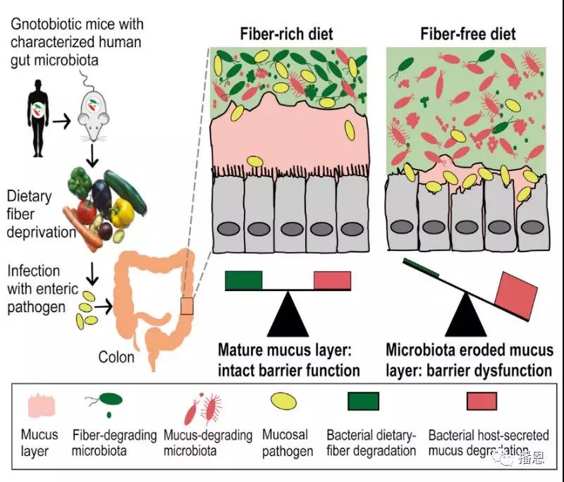 而飼喂大鼠缺乏膳食纖維的日糧(Fiber-freediet)時(shí),腸道黏膜的粘蛋白含量很少,形成的“墻”很薄,此時(shí)腸黏膜的屏障能力很差,而且致病微生物也已經(jīng)開(kāi)始侵蝕腸上皮細(xì)胞。因此,給“二師兄”補(bǔ)充膳食纖維也是一種行之有效的提高“二師兄”“內(nèi)在修為”的途徑。