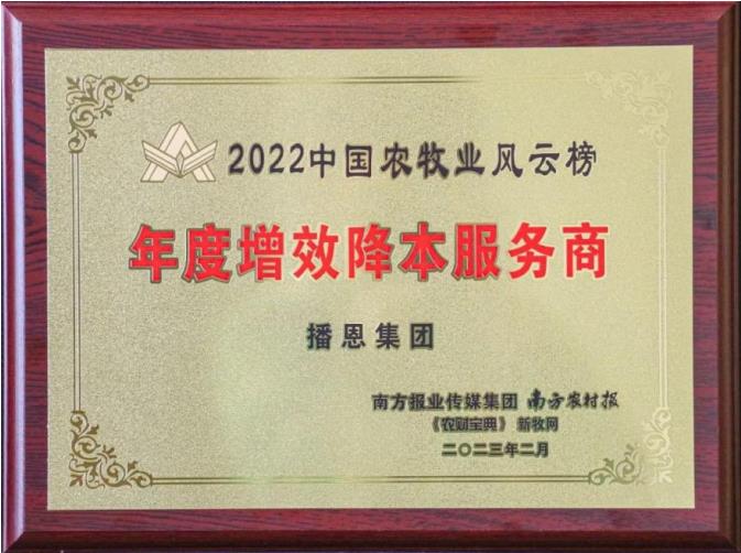 而作為一家專注創(chuàng)新的科技型企業(yè)集團,播恩以“降本增效”為核心關(guān)注點,從解決用戶迫切需求出發(fā),從管理、采購、生產(chǎn)、技術(shù)、服務(wù)等各個方面真抓實干,注重細(xì)節(jié)、創(chuàng)新與效率,為用戶提供了基于生物工程技術(shù)的降本增效解決方案。2023年2月21日,第十二屆中國農(nóng)牧業(yè)風(fēng)云會上,播恩集團榮獲“2022年度增效降本服務(wù)商”稱號。