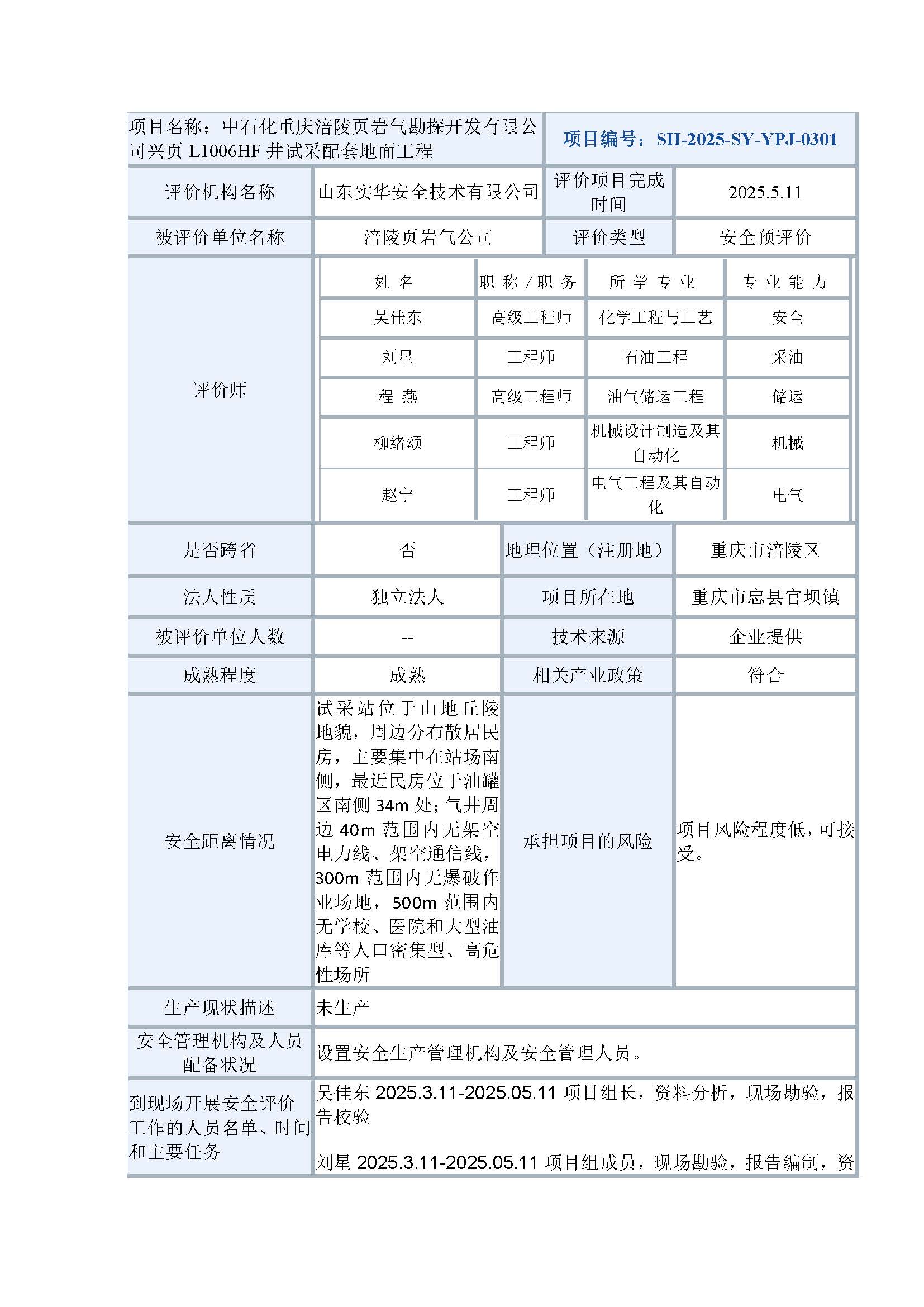 中石化重慶涪陵頁巖氣勘探開發(fā)有限公司興頁L1006HF井試采配套地面工程安全預(yù)評價