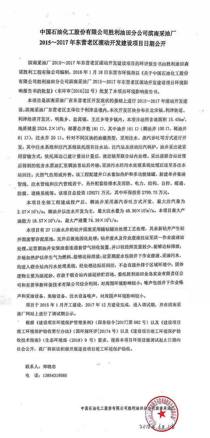 中國石油化工股份有限公司勝利油田分公司濱南采油廠2015~2017年東營老區(qū)滾動開發(fā)建設項目日期公開