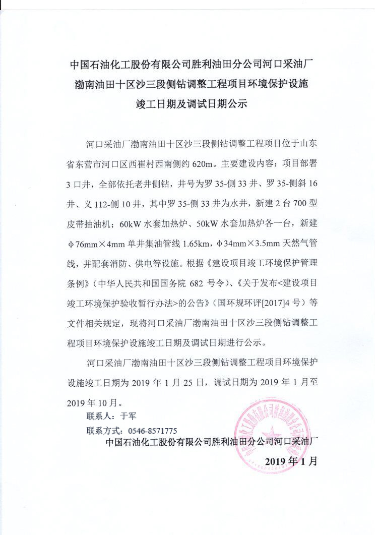 中國石油化工股份有限公司勝利油田分公司河口采油廠渤南油田十區(qū)沙三段側(cè)鉆調(diào)整工程項目環(huán)境保護設(shè)施竣工日期及調(diào)試日期公示